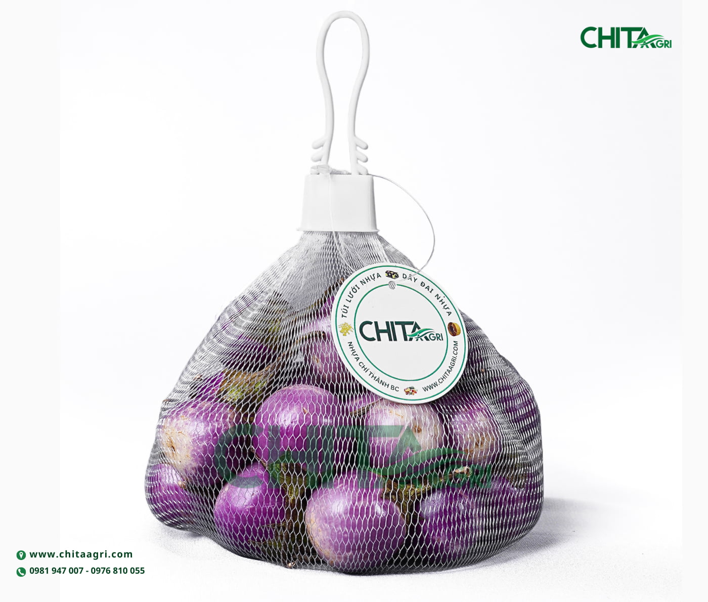 Để đóng gói cà pháo đẹp – chắc chắn – thu hút khách hàng, có thể kết hợp Túi lưới và khóa túi lưới đồng bộ Chita Agri: